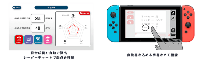 さらには、サポート機能である「成績」モードで、プレイ履歴から算出する目安級とともに、ジャンル別の成績がレーダーチャートで表示。自分のレベルと弱点を把握して、より上の成績を目指すことができます。