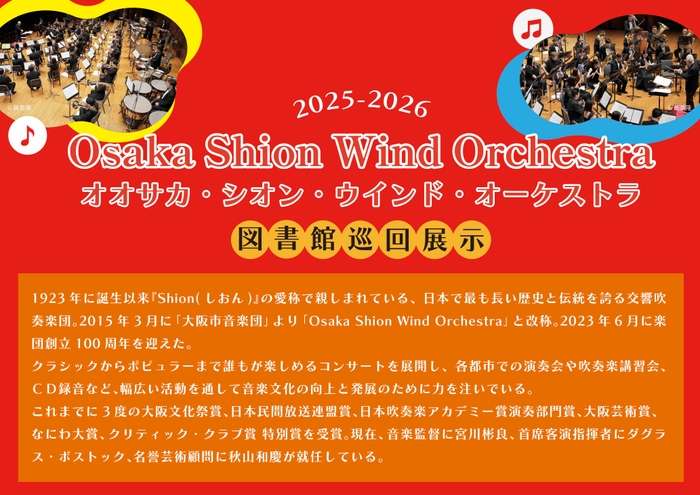 日本で最も長い歴史と伝統を誇る交響吹奏楽団のOsaka Shion Wind Orchestraを有する公益社団法人大阪市音楽団(本社:大阪市住之江区/理事長:石井徹哉)は、2023年6月に創立100周年を迎え、それを機に中央図書館をはじめ、大阪市内の図書館で巡回展示を行っています。