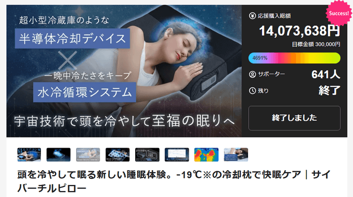 半導体技術による冷却加熱機能と、水循環システムを搭載した冷却枕、サイバーチルピローは2025年3月26日にMakuakeで先行販売を開始し、気温が高くなるにつれ多くの反響をいただくようになりました。その結果、目標金額の3000%を達成しプロジェクトは大成功を収めました。