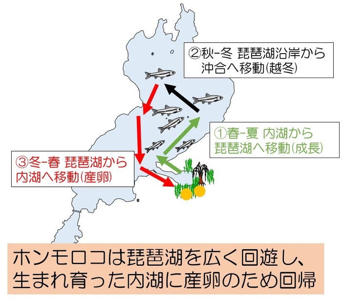 これにより、ホンモロコは、産卵場である内湖から琵琶湖の沿岸、沖合の深場へと成長に伴い回遊し、翌年には成熟して生まれた内湖に産卵回帰※2 することがわかりました。