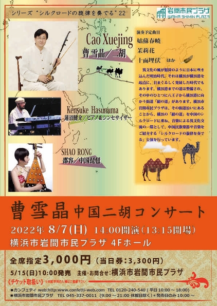 横浜市岩間市民プラザ主催、シルクロードの旋律を奏でる22『曹 雪晶 中国二胡コンサート』が2022年8月7日 (日)に横浜市岩間市民プラザ(神奈川県横浜市)にて開催されます。