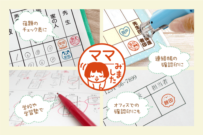 お子さまの連絡帳や音読カードのサイン、塾や学校の先生が提出物に押す確認印に使える、かわいいイラスト入り印鑑です。回覧板のサインやオフィスでのチェック印などにもオススメです。