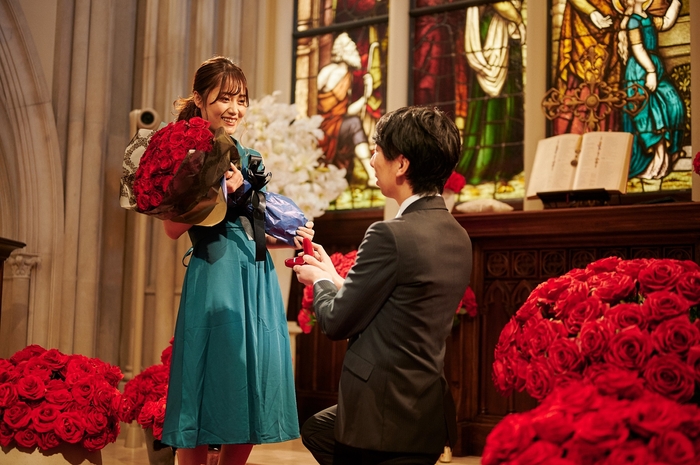 チャペルの祭壇を彩るのは、「1万年の愛を誓います」の意味を持つ1,000本の大輪の赤バラのアートフラワー(造花)。チャペルの扉を開けるとそこには映画のワンシーンのようなロマンティックな空間が広がります。普段は入ることのできない「チャペル」という神聖な空間を、まるでふたりを主役とした映画の舞台のようにドラマティックに彩ります。ステンドグラスが美しい重厚なチャペル、自然光が主役のお二人を優しく包み込む森に囲まれたチャペル、夜景がドラマティックに煌めく独立型のチャペルなどに加え、緑あふれるガーデンや、水辺のテラスなどにも設置可能なので、趣の異なる様々なプロポーズのための特別な空間をお選びいただけます。