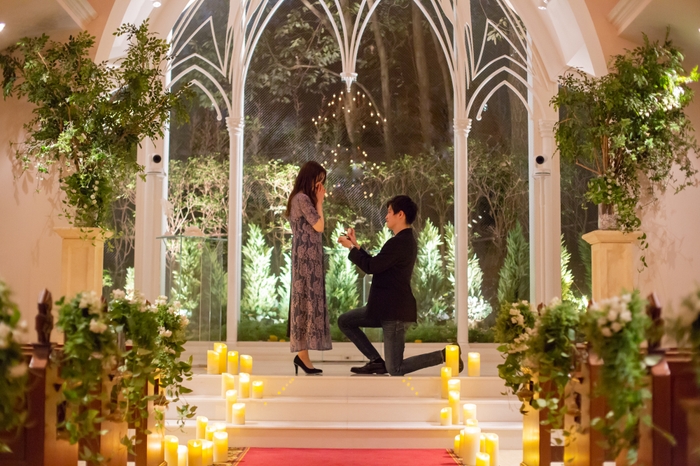 レストランでディナーコースをご堪能後、貸切チャペルへと移動し、ふたりきりでサプライズプロポーズを行う、人気の「チャペルdeプロポーズ」プランをはじめ、ロマンチックなキャンドルやランタンデコレーションが施された宿泊ルームでの「スイートルームdeプロポーズ」プランなどで、これまで多くのカップルのプロポーズをお手伝いして参りました。