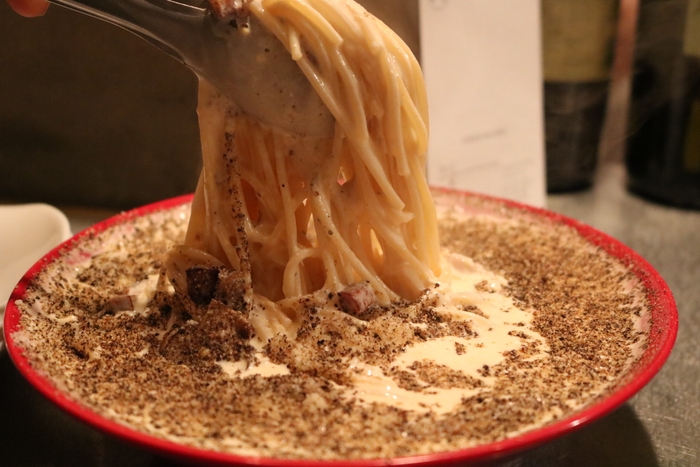 パスタが見えなくなるまで注がれた生クリームたっぷりのソース、お皿一面を覆い尽くす黒コショウ、掟破りの替え玉など個性が詰め込まれたカルボナーラで、そのビジュアルや美味しさが話題となり、TV、雑誌、WEBサイトなど数え切れないほどのメディアに取り上げられた正に伝説級のパスタ料理です。