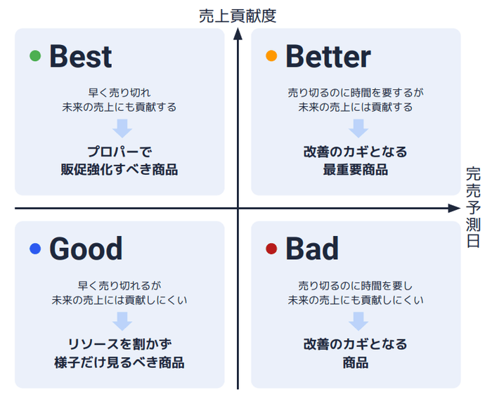 これは、全ての在庫を対象に在庫リスク(完売予測日)と売上・利益に対する貢献度の2軸で評価し、可視化できるためです(下図参照)。