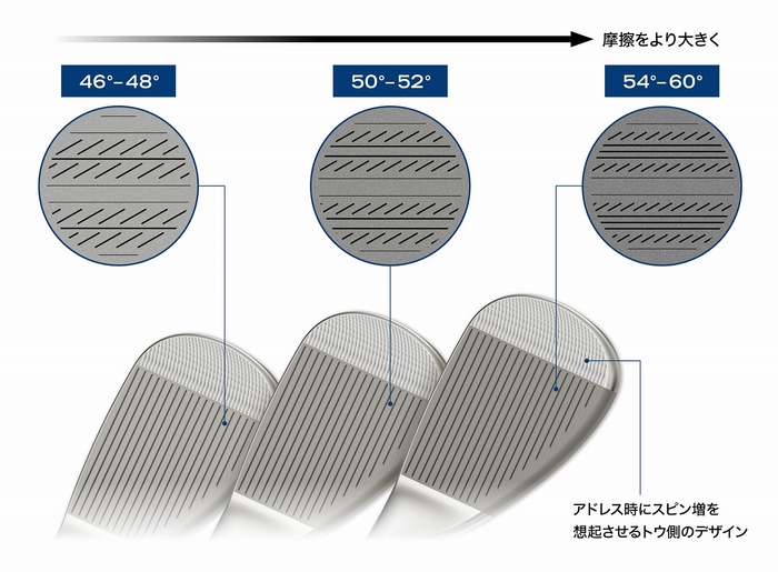 最大19本の深く狭い高精度のグルーブ(溝)設計が、優れたスピンコントロール性能を発揮します。独自の製法でフェース熱処理の時間と温度を調整し、高い耐久性を生み出すことによりスピン性能が持続します。