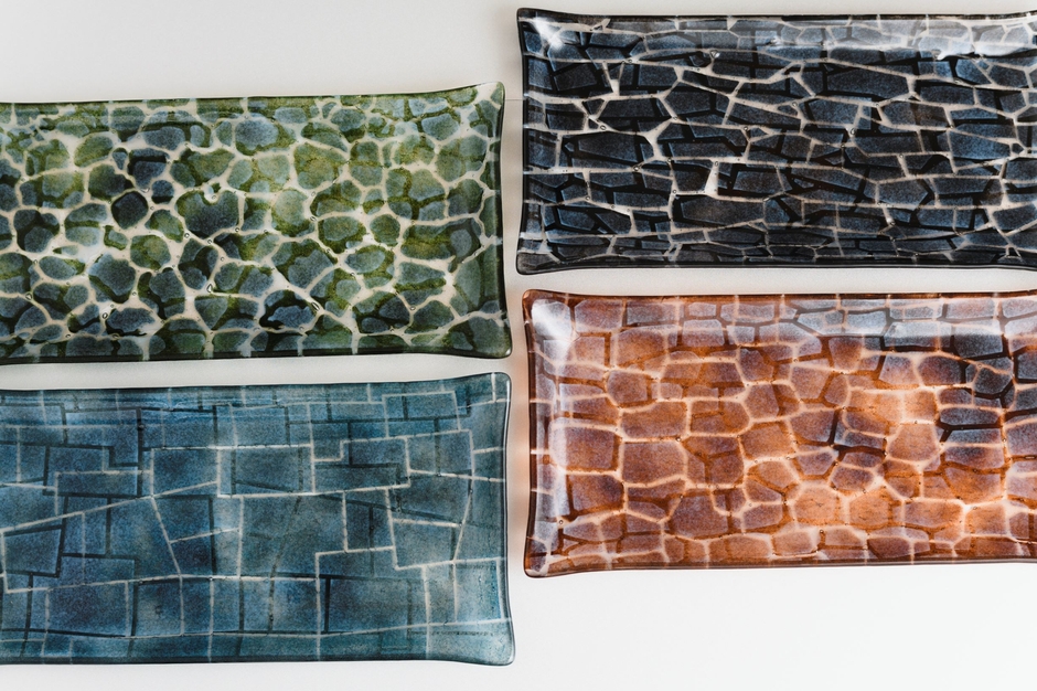 グスクの石垣は力強さと自由な造形が特徴でそのパータンを抽象化し表現。今帰仁城の「黒」は歴史の積み重なった重厚感、青空に龍が舞う「青」糸数城、森の聖地「緑」知念城、夕日の綺麗な「赤茶」座喜味城。模様はパータンの重ね合わせですが重ね方は同じものがなく、一つ一つの製品が1点もの。落ち着いた色合いは料理との相性が良く、おうち時間を楽しむ器となっています。沖縄のグスクは曲線美がとても印象的です。
