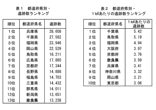 奈文研が所在する奈良県では13,238遺跡が確認されていますが、遺跡数の都道府県ランキングでは13位と、意外と順位が高くないことがわかります(表1)。ただし、この遺跡数を各都道府県の面積で割ると、奈良県は1㎢あたり3.59遺跡で、全国平均(=1.2遺跡)の約3倍です。都道府県ランキングでも6位に浮上し、やはり遺跡の多い地域であることがわかります(表2)。