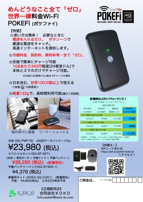 合同会社KOKO(本社:東京都江戸川区、代表:尾形 和昭)は、世界一律料金Wi-Fi『POKEFi (ポケファイ)』のオプションとして、車載キットを2月22日から限定発売します。