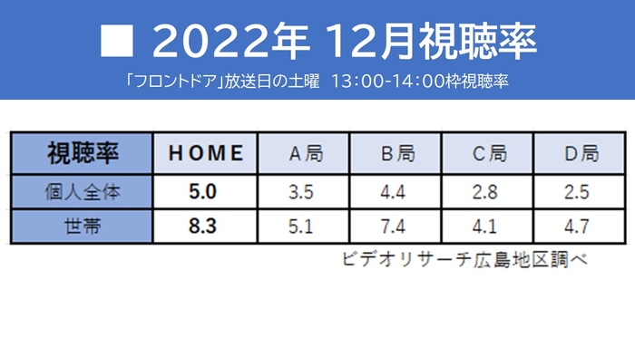ひろしま深掘りライブ「フロントドア」月間 同時間帯視聴率 9カ月連続1位を獲得