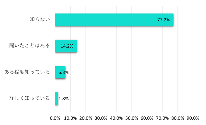 77.2%が「知らない」と回答し、「聞いたことはある」「ある程度知っている」「詳しく知っている」といった少しでもガイドラインの存在を知っている人は全体の22.8%でした。