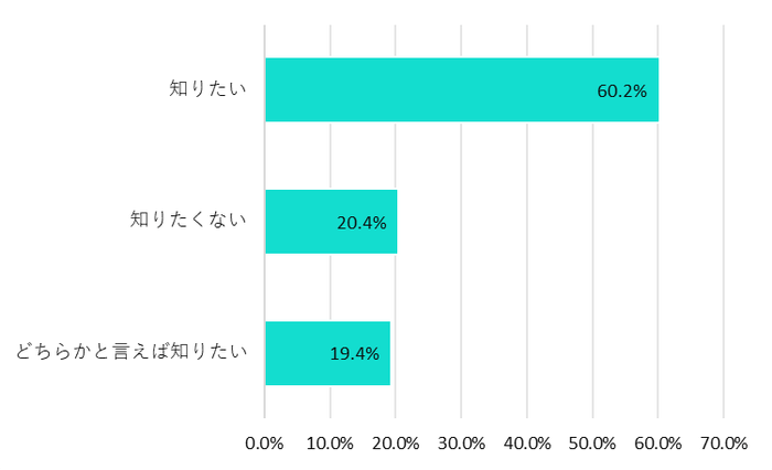 60.2%が「知りたい」、19.4%が「どちらかと言えば知りたい」と回答し、多くの方が不動産を買う、借りる前に事故物件かどうかについて知りたいという結果になりました。