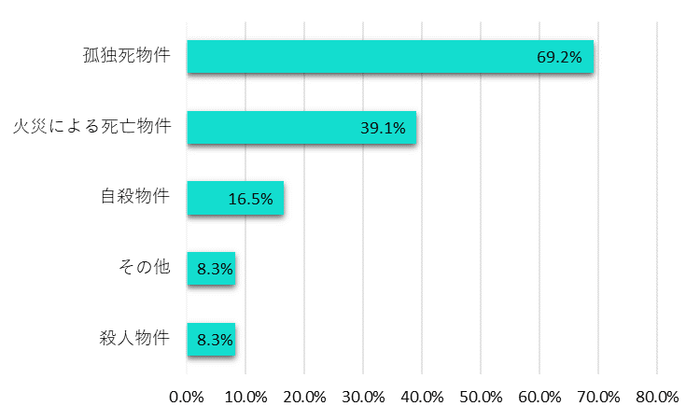 事件性がない死因である「孤独死物件」に住めると回答した人は69.2%でトップに。 16.5%が「自殺物件」、8.3%が「殺人物件」に住めると回答しています。
