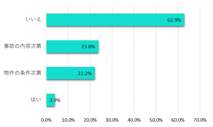 62.9%が「いいえ」と答えている一方で、23.8%が「事故物件の内容次第」、22.2%が「物件の条件次第」と回答しており、何かしらメリットが感じられる内容があれば事故物件に住めるようです。