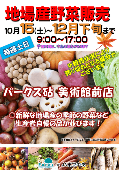 秋冬の地場野菜販売第一弾として砧公園 パークス砧美術館前店で開催いたします。