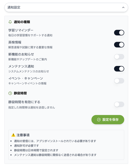 • 学習リマインダーの送信時刻をユーザー自身が設定できる機能