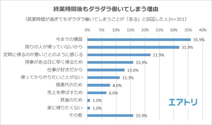 ダラダラ働いてしまった経験がある人に対して理由を聞いたところ、最も多かったのが「今までの慣習」(35.9%)、僅差で「周りの人が帰っていないから」(31.9%)、「定時に帰ることが悪いことのように感じる」(21.9%)が続きました。「残業代を稼ぐため」「用事がある日に早く帰るため」などの明確な意図ではなく、今までの勤勉な労働姿勢や周りの人の目を気にしてしまう日本人らしい生真面目さがマイナスの形となって表れているようです。