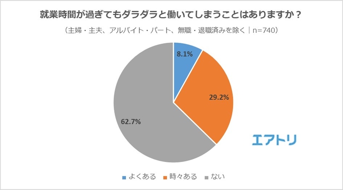 「よくある」が8.1%、「時々ある」が29.2%と37.3%もの人が定時を過ぎてもダラダラ働いてしまった経験があることが分かりました。