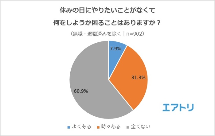「よくある」は7.9%、「時々ある」は31.3%と約4割の人が経験ありと回答しました。日々の仕事に追われ、趣味を持つゆとりが無かったり、仕事以外の時間はエネルギーが残っておらず寝て過ごしてしまうような人が一定数いることが窺える結果となりました。