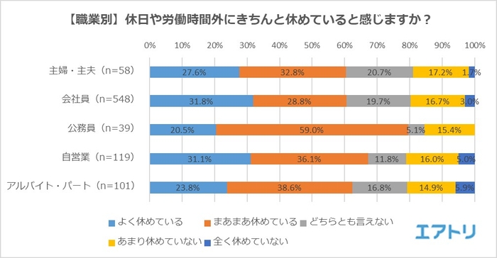最も休めているのは「公務員」。最も休めていないのは「主婦・主夫」