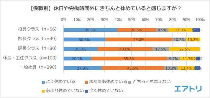 ―「よく休めている」「まあまあ休めている」と回答した割合が最も少なかったのが「課長クラス」、次いで「役員クラス」となりました。