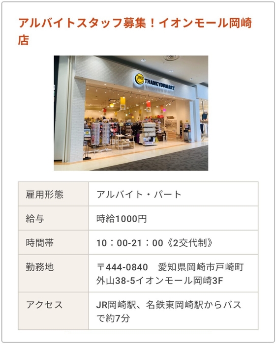 勤務地:〒444-0840 愛知県岡崎市戸崎町外山38-5イオンモール岡崎3F