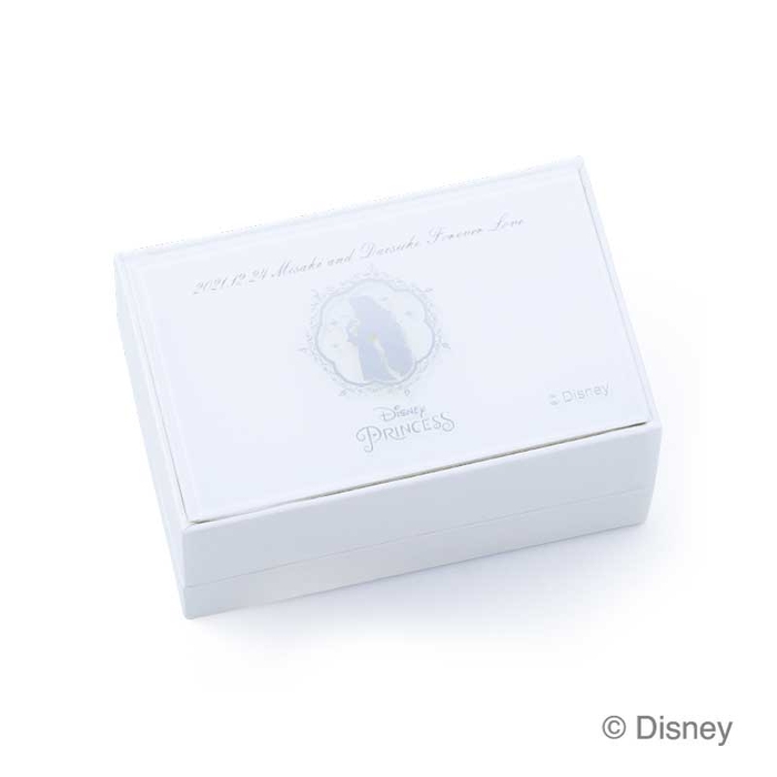 「ラプンツェル」がデザインされた専用のジュエリーボックスに、おふたりの記念日やお名前、メッセージ(3種類から選択)を刻印させていただきます。