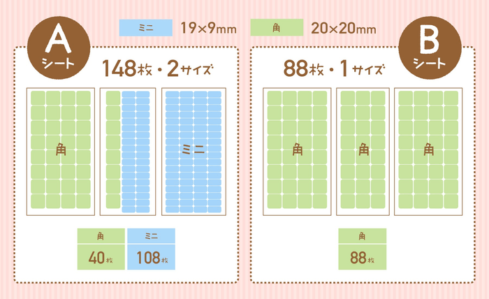 「大きめシールが沢山欲しい」「細かいところへ貼る機会がない」などのお声をいただき、2022年秋にBシートを追加しました。