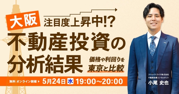尚、当社では定期的に不動産投資に関するオンラインセミナーを開催しておりますが、本プロジェクトで得た知見を基に、新たに大阪エリアに関するセミナーコンテンツである『注目度上昇中!?大阪不動産投資の分析結果〜価格や利回りを東京と比較〜(講師:当社コンサルタント 小尾 史也)』を公開いたしました(参加費無料)。