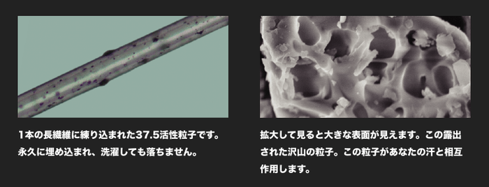 コントロールαは、米国ココナ社が開発した吸湿速乾繊維「37.5テクノジー」を採用しています。繊維に練りこまれた火山灰から採取された活性化粒子により、衣服内を人が快適とされる湿度に調整することで暑い時には涼しく、寒い時には暖かく保つことができます。活性化粒子にはミクロの孔(あな)があり、通常の繊維の約8倍の表面積を持っていることで暑い時は汗の湿気を吸収し熱と ともに外に放出し、寒い時は体から出る熱を粒子が閉じ 込めるため暖かく感じます。繊維に埋め込まれた活性化粒子は洗濯により洗い流されたりつぶされたりすることなく、効果は半永久的に持続します。