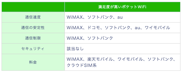 その他、それぞれの項目で満足度が高かったポケットWiFiをまとめた表が以下です。