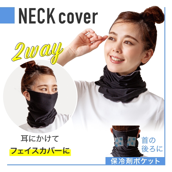 強い紫外線、真夏の暑さから完全ブロック。首回りデコルテをしっかりカバー。一枚でネックカバーとフェイスカバーの2way仕様。ゆったりとしたデザインで通気性、伸縮性抜群。汗をかいてもべたつき感が気にならず、首筋、デコルテラインを強い日差しから守ります。