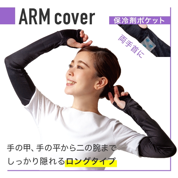 指穴付きで手の甲まで覆えるロング丈サイズのアームカバー。冷却メッシュ&伸縮性のある素材は野外で行うスポーツやアウトドア、登山にもぴったり。