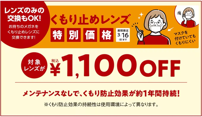 くもり止めレンズが税込¥1,100OFF!メンテナンスなしで、くもり防止効果が約1年間持続するので、冬の寒い時期やマスク着用時も快適です。もちろんお持ちのメガネフレームにも交換可能です。
