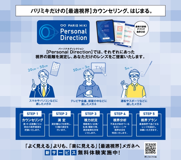 パリミキでは単に視力を上げるのではなく、生活のそれぞれのシーンに適した見え方【最適視界】で暮らすという考え方をおすすめしています。お一人おひとりの生活シーンに合わせたパーソナル対応型カウンセリング【Personal Direction(パーソナルディレクション)】では、それぞれにあった視界の距離を測定し、あなただけのレンズをご提案いたします。