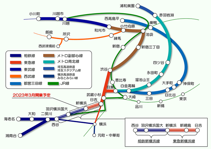 ※相鉄新横浜線・東急新横浜線は、相鉄本線・相鉄いずみ野線、東急東横線・目黒線に接続し、東京メトロ南北線・副都心線、都営三田線、埼玉高速鉄道埼玉スタジアム線、東武東上線まで直通運転を行います。具体的な運行計画については、後日改めてお知らせいたします。