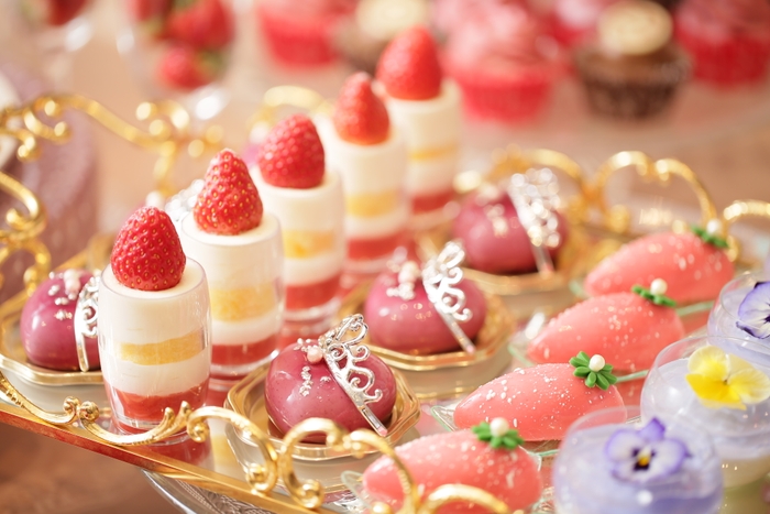 ガラスの靴といちごティラミス・シンデレラショートケーキ・ストライプロールケーキ・いちごたっぷりタルト・いちごとピスタチオのパリブレスト・タイベリーのハートムース・ストロベリームース・あまおうのキャンドルヴェリーヌ・ハーブティーのパンナコッタ・いちごプディング・カヌレ・マカロン2種(いちごとレモン)・サブレバニラ・季節のアイスクリーム・いちごとチョコのマフィンタワー・王様のチョコレートムース・プリンセス&プリンス ストロベリー食べ放題 など約20種