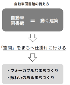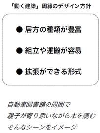 建築学の観点から、自動車図書館をどう位置づけるべきか。我々はそれを「動く建築」として捉えることにした。「動く建築」にできること。それは、空間という塊を持って、まちへ仕掛けに行けること。その先には、ウォーカブルなまちづくりや、賑わいのあるまちづくりに貢献できる。そんな力を秘めていると考えている。