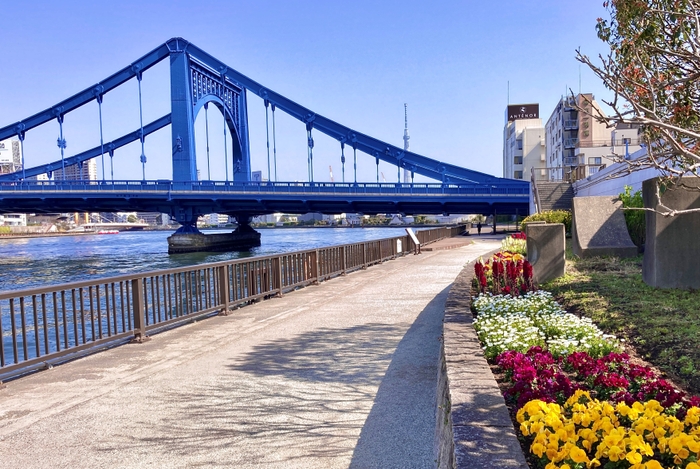 隅田川テラスには、形も規模もさまざまな花壇が多く設置され、四季折々に咲く花壇の花々が、散策する人たちの目を楽しませてくれます。