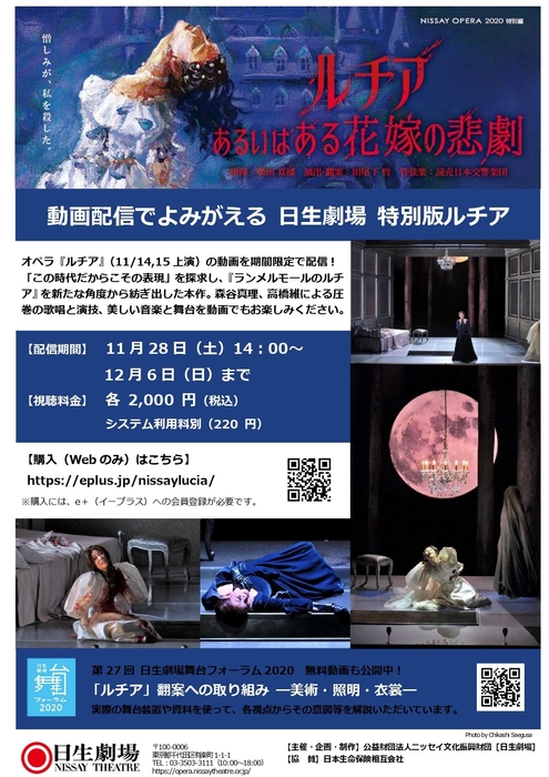 日生劇場にて、11 月 14 日(土)、15 日(日)に上演された NISSAY OPERA 2020 特別編 オペラ『ルチアあるいはある花嫁の悲劇』の動画を11月28日(土)~12月6日(日)の期間限定で配信!動画視聴券発売中です。