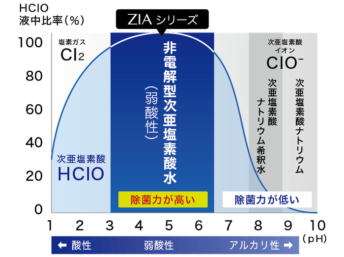 一方、弱酸性の非電解型次亜塩素酸水は除菌力が高く、安全です。ZIAシリーズはpH6.5〜3.0の弱酸性の間で、1年程度の安定長期保存を実現しています。