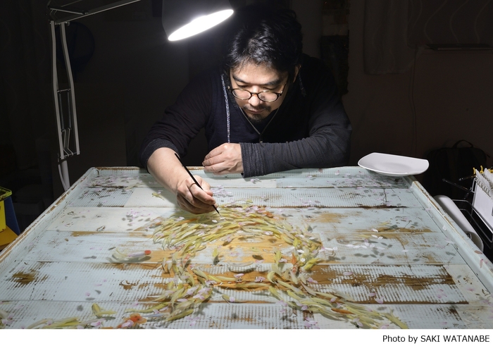 「飼っていた金魚の美しさに魅せられて以来、金魚を描き続けてきました。独自の技法を模索していく中で辿り着いたのが、『2・5Dペインティング』です。樹脂と絵の具の層を何度も重ねることで、羽衣のようなヒレや透明感といった金魚の美しさを表現しています。升の中に金魚を描いた代表作の『金魚酒』シリーズを数多く展示しているので、次第に技術が上がってどんどん立体的になっていく変遷を見てもらえます。その他にも、絵画やインスタレーションなど幅広い作品が展示されています。これほど大規模な個展は大阪では初めてですので、ぜひ楽しんでご覧ください。」