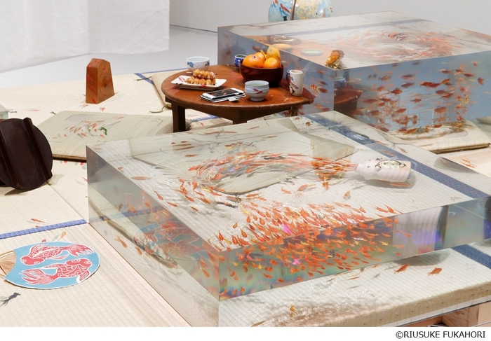 幼少期から釣りを好み、水に親しんでいた深堀によれば、水面は此岸と彼岸、生と死、現実と霊魂の境界線だという。本展初公開の新作《方丈ノ夢》では、金魚を樹脂の中から畳の上まで泳ぎ回らせることでその境界を越える試みがなされた。またここでは、日々の金魚の飼育で得た気づきから得た死生観や宇宙観を展示空間に展開し、金魚と人間の営みを重ねたインスタレーションとして構成される。