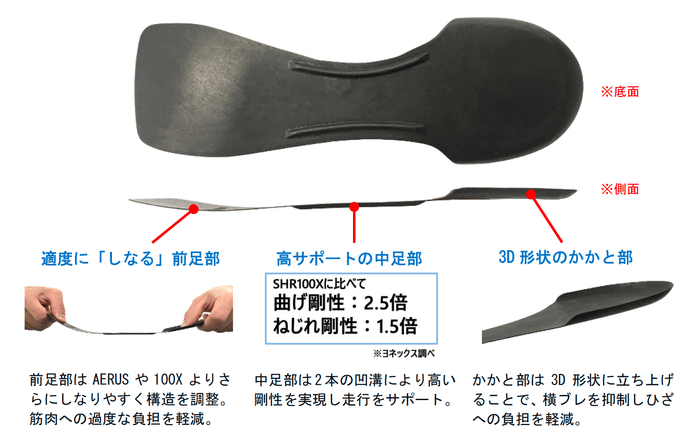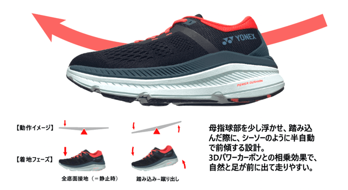 また、ミッドソールに内蔵した「3Dパワーカーボン」は、かかと部の周囲を立ち上げ、高い走行安定性を実現するとともに、適度なしなりが筋肉への負担を軽減し、前方への推進力を生みます。加えて、ヨネックス史上最大のソール幅に拡げた「ワイドコンタクト設計」により横ブレを抑制し、安定性を向上。さらに、シューズ底面を緩やかにカーブさせた形状で自然に足が前に出る設計とし、長距離でも疲れにくく、よりラクな走行を可能にします。