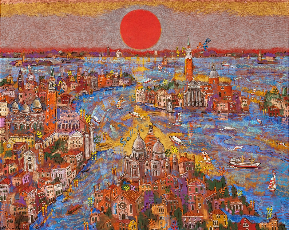 アドリア海を背景に、朝陽によって鮮やかに浮かび上がるヴェネツィアの街並みを俯瞰的に描いている。カナル・グランデ(大運河)に寄り添うように築かれた街並みや離島にそびえる美しい教会や鐘楼が、水面に反射する陽光に包まれ、繊細優美な抒情性を醸し出している。若き日のヴェネツィア留学の記憶が詰まった記念碑的作品。