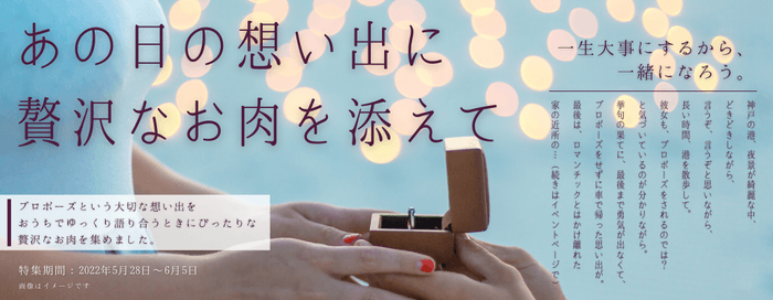このイベントは、ジューンブライドである6月にちなみ、お家でゆっくり、少し贅沢なお肉でプロポーズの思い出を語り合っていただきたいという思いからこの企画が生まれました。プロポーズの大切な想い出とともに食べる贅沢なお肉(ランプ、ヒレ、サーロインなどのステーキ)を多数準備しています。イベントバナーには、担当スタッフのプロポーズの想い出も掲載しています。