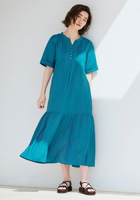 ピンタックや裾のティアードがポイントのフェミニンワンピースは、二の腕カバーができる半袖仕様になっています。