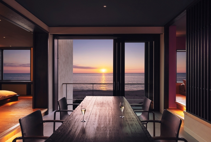 星のや沖縄の客室は全室がオーシャンフロントで、ベッドルームとリビングスペースのあるスイートルームです。旅の最終日の夕食は、客室内の広々とした「土間ダイニング」で楽しむ、グルクンや島らっきょう、もずくといった沖縄ならではの食材を使ったメニューです。あらかじめ下準備を済ませた状態で料理が届けられるため、簡単な工程を加えるだけでいつでも好きな時に出来立ての料理を味わえます。風が通り抜け、波音に包まれる「土間ダイニング」での夕食は、時間にとらわれずに自由にリゾートでの滞在を楽しむための、新しい食事スタイルです。大きなテーブルを囲み、出来立ての料理を味わいながら旅の思い出を語らうひとときを過ごせます。