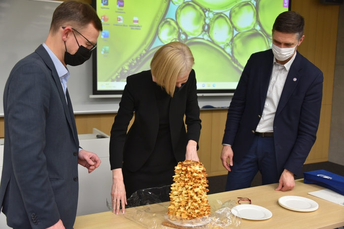 講演後には、バウムクーヘンに似たリトアニアのケーキ「シャコティス」を参加者全員で味わいました。さらに、11月9日から毎週水曜日にボランティア・ガイド育成プログラムの講座で杉原千畝の功績などを学んできた受講生24人に認定証が渡されました。山口ひかりさん(経営学部1年)は「講座では加害者側の視点でも歴史を学ぶことができたので、ガイドの時にはそうした視点も生かしたいです」と話していました。